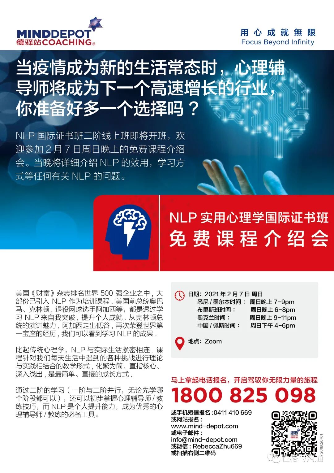 Mind Depot Coaching 德驿站® 实用心理学是澳纽美第一家中文NLP国际证书授证机构,2008年成立于悉尼。提供NLP(Neuro-Linguistic Programming 身心语言程序学) 、TLT (Time Line Therapy® 时间线疗法), 和NLP教练技术等优质课程及研讨会。综合中国固有的传统文化资讯,分别在悉尼、墨尔本、布里斯班、珀斯、奥克兰、以及洛杉矶等地举办不同程度的NLP培训和讲座。结合视觉、听觉和现场培训的经验,帮助广大学员推进事业、家庭、健康的成功。NLP培训课程旨在为学员提供完全突破原有思维模式的知识、技能与技术,通过个人与团体的搭配,进阶式的练习,迈向更成功的人生。